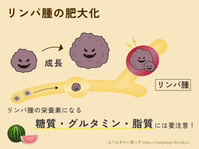 がん細胞は、生き延びるためにエネルギーを大量に消費します。スイカやミルワームなどのおやつは栄養素として腫瘍の成長を促してしまう可能性があるため、与える量や頻度に気を配る必要があります。