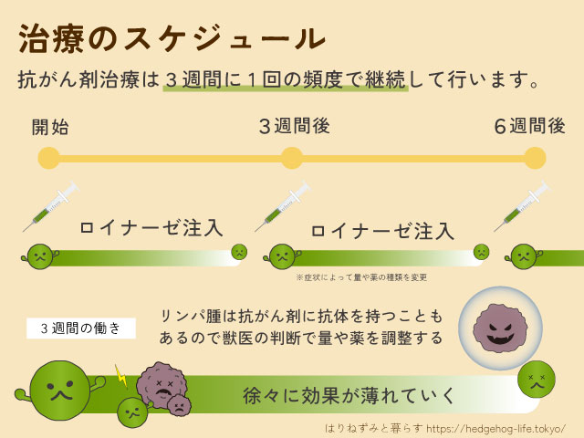 リンパ腫の治療にはがん細胞の増殖サイクルに合わせて行います。がんの細胞分裂は約3週間前後とされており、そのタイミングでロイナーゼを注射することになりました。徐々に効果が薄れる部分はステロイドが補ってくれるイメージです。