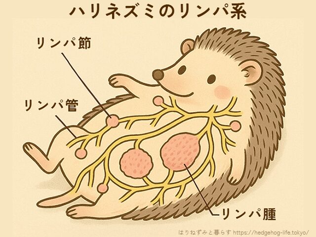 ハリネズミの体には「リンパ管」と「リンパ節」が全身に張り巡らされており、体内の異物を排除したり免疫を保つ働きをしています。この通路を「リンパ系」と呼び、病気から体を守る大切な役割をしています。