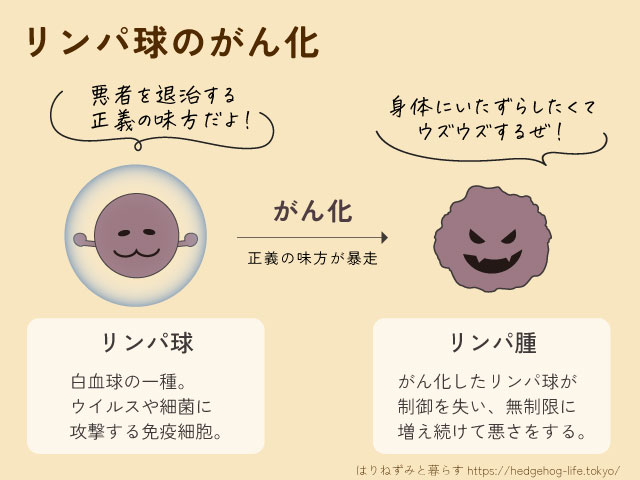 本来、体を守るはずのリンパ球が何らかの理由で異常を起こし、がん細胞になってしまうことを「リンパ腫」といいます。がん化したリンパ球は増殖のブレーキが効かなくなり、正常な細胞を押しのけてどんどん増え、体の中で悪さをするようになります。