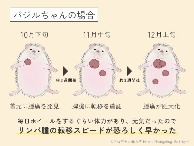 今回はハリネズミのリンパ腫について詳しくお伝えしました。1つの腫瘍から始まったバジルちゃんのリンパ腫の闘病生活はたった3ヶ月の間に7つに増えていました。それでも力強く、前向きに頑張っていたバジルちゃんの生きた証を残したいと思い記事にすることにしました。