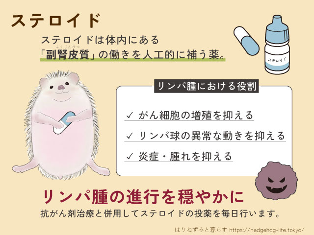 ステロイド(プレドニン)は炎症を抑える働きや免疫の反応をコントロールするお薬ですが、がん治療ではがん細胞の活動を弱めるという目的でも使われます。ロイナーゼと併用することで、リンパ腫の進行を遅らせたり症状を和らげるために使用していました。ステロイドは1度使い始めたら基本的に毎日投薬が必要です。途中で急にやめてしまうと、体調のバランスが崩れたり症状が急激に悪化することがあります。