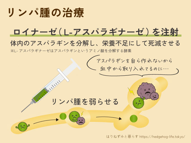 ロイナーゼ(アスパラギナーゼ)は抗がん剤のひとつで、がん細胞の栄養源であるアスパラギンというアミノ酸を分解する作用があります。リンパ腫のリンパ球はアスパラギンがないと増殖できないため、がん細胞の増殖スピードを抑える効果が期待されます。