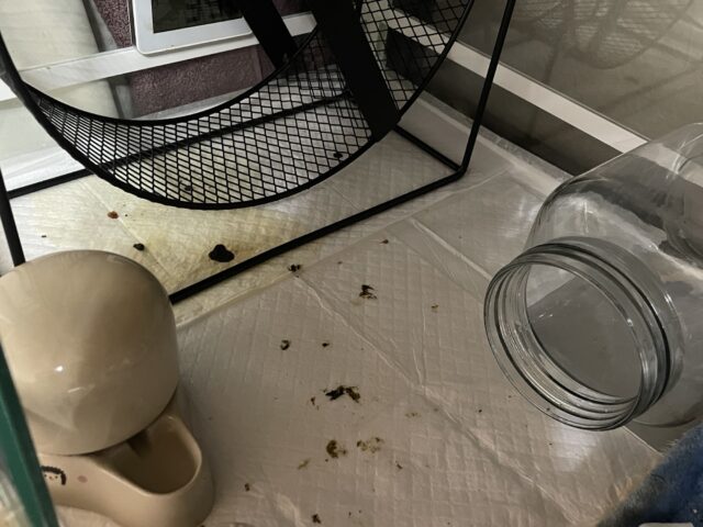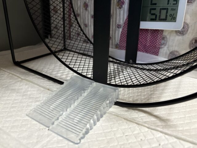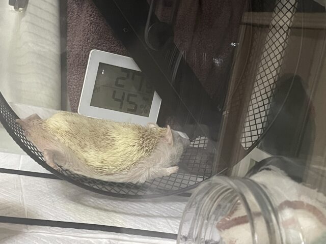 免疫が下がらないように27℃をキープし、ホイール下など野良寝する場所にも床ヒーターを設置しました。バジルちゃんのいるケージ下にはミニ床暖が置かれています。