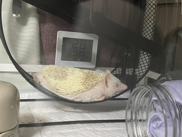 耳のよいハリネズミは酸素缶の音にびっくりしてしまうので、長めのチューブにミニロートを付けて酸素を与えていました。
