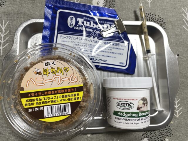 もともと食へのこだわりが強いバジルちゃんに、先生から離乳食用のコーンはハリネズミに与えても大丈夫とアドバイスをもらいました。ヘルスチャージとエナジー500はハリ友さんに教えていただいたものです。ハリネズミフードをあまり口にしなくなったため、とにかく食べれるものを中心に与えていました。