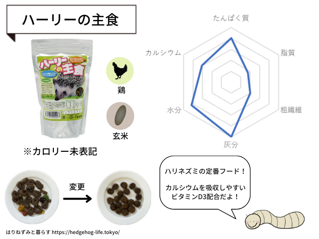 食いつき抜群!ハリネズミから絶大な指示を受けているハーリーの主食です。こちらはタンパク質と灰分が多めのフードでした。食い付きが良いので脂質が高いのかと思ったら意外と高くありませんでした。